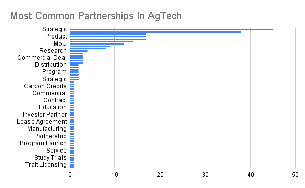 Deal structures skew toward integrations (product, technology, and platform), with research partnerships and MoUs as on-ramps to commercialization; joint ventures appear where asset intensity is high (indoor farms, funds, facilities). Notable themes cut across sectors: (1) data interoperability from field sensor → satellite → AI model → retailer/bank workflow; (2) measurement and verification (regen, carbon, Scope 3) embedded into input distribution and grower services; and (3) regionalization—solutions localized via local banks, co-ops, universities, and public agencies to accelerate adoption. Overall, partnerships are being used less as one-off pilots and more as scale mechanisms linking agronomy, data, finance, and distribution.